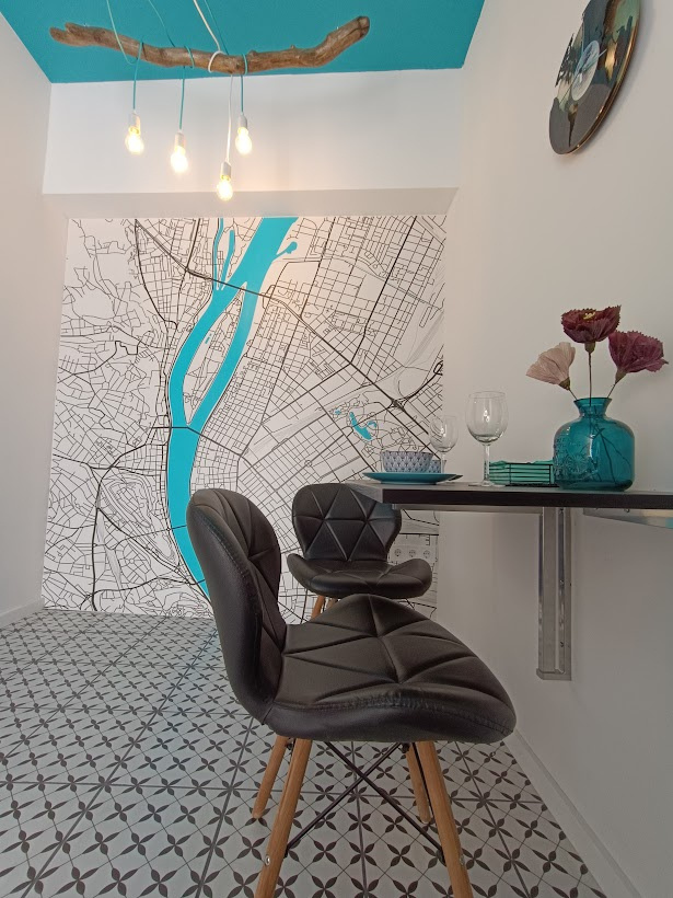 Budapest életében a Duna központi szerepet játszik ezért szerttünk volna egy apartmant mindenképp a Dunának szentelni. A színek és a berenezések mind kapcsolódnak a vízhez, ideális választás pároknak.